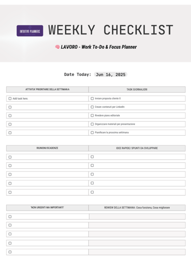 💡 Ogni pagina è studiata per aiutarti a scaricare la mente, organizzare le tue priorità, pianificare con realismo e soprattutto ritrovare equilibrio tra produttività e benessere.