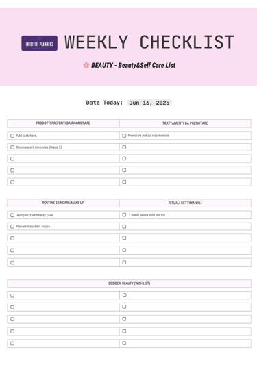 📋 Liste modificabili su Canva, pronte per essere personalizzate, stampate (consigliamo il formato A3!) e utilizzate ogni settimana per tutte le principali categorie del tuo benessere e della tua vita quotidiana: